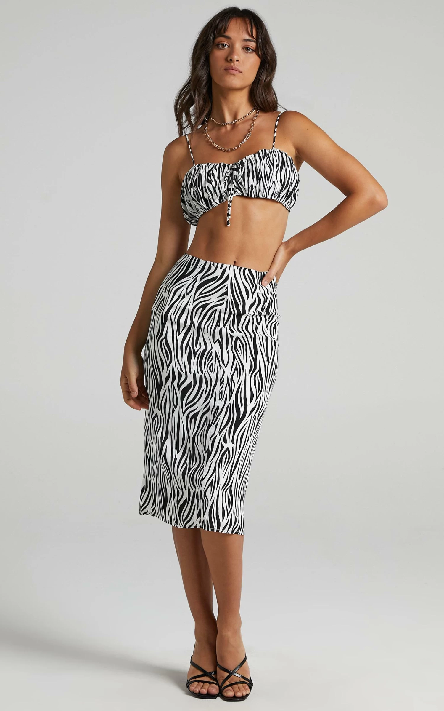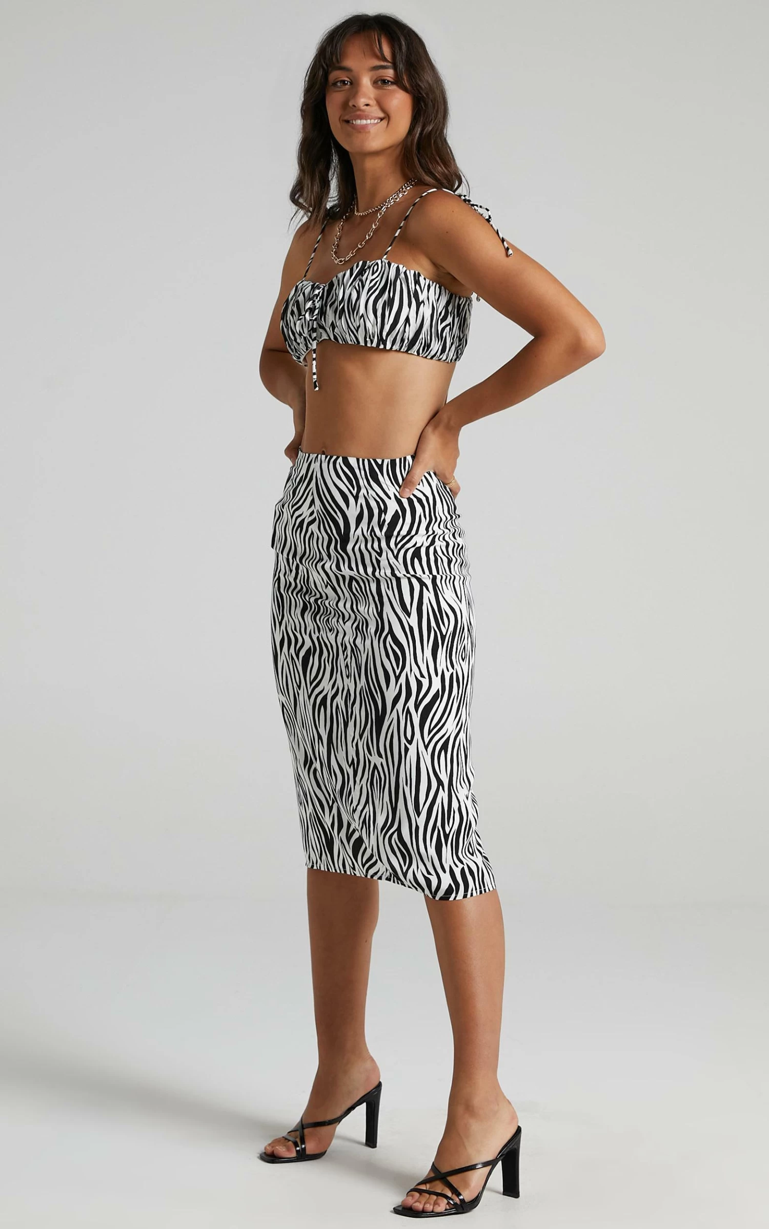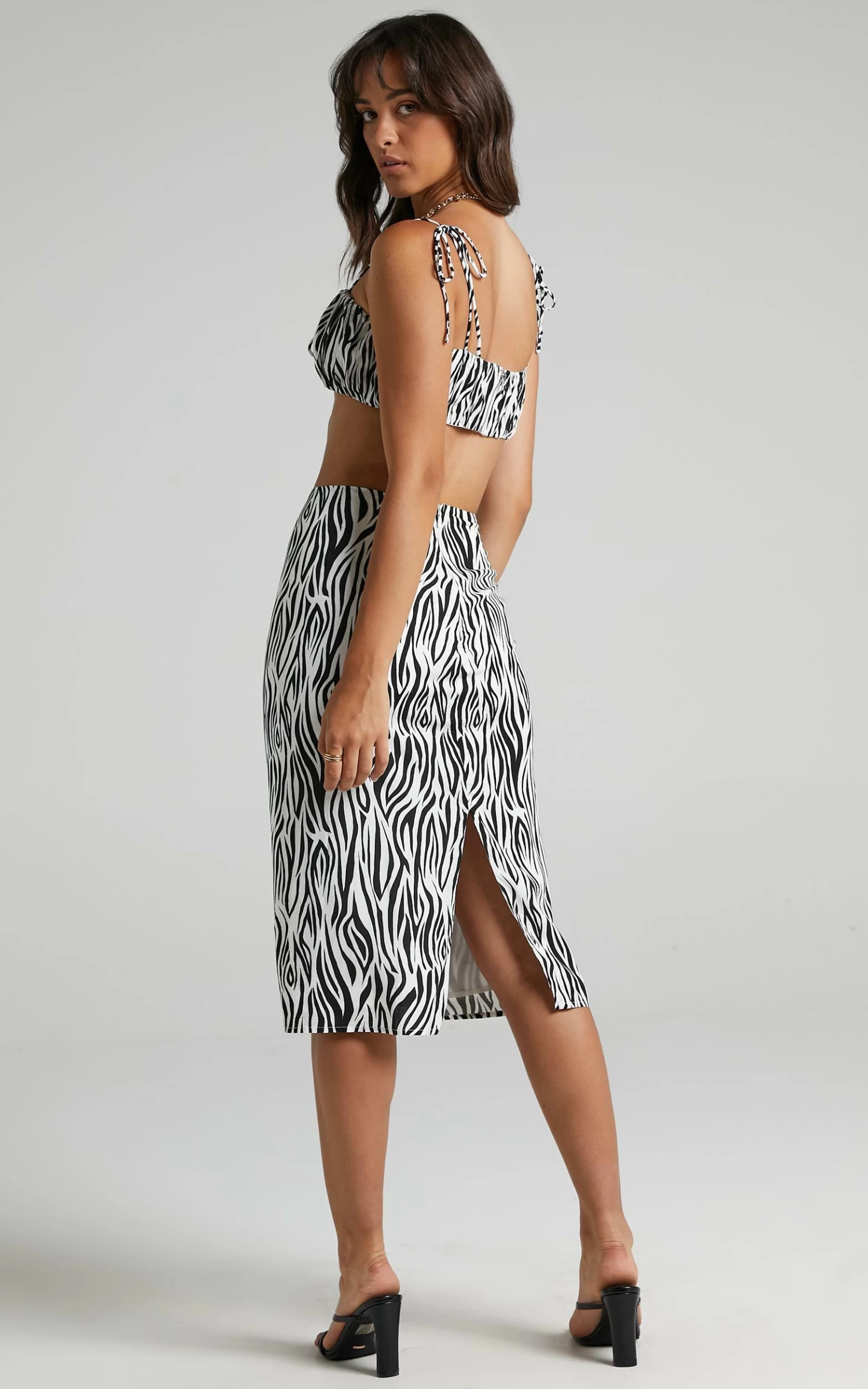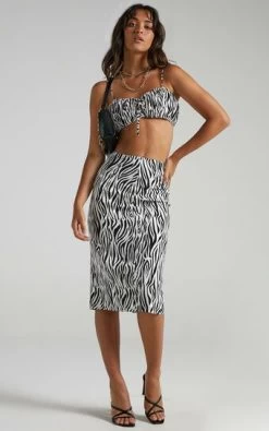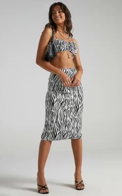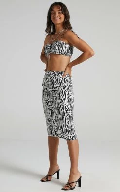 Get your uber cool girl vibe on in the Uberta two piece which features a crop top and skirt woven in an eye-catching zebra pattern. Made from a fully lined and breathable viscose, the top is shaped with self-fastening spaghetti ties and secured with a metallic back zip, while the skirt sits at a high-rise waist fit with a concealed side zip and finishes with a sneaky side split.