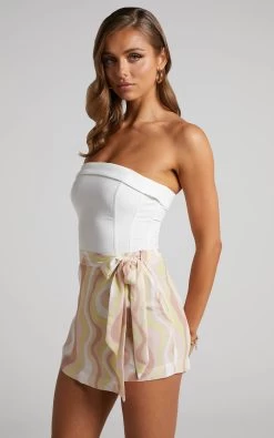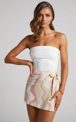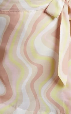 Your next perfect party look is waiting with the Vaira Mini Skort! This stunner features a self-fastening wrap front and a retro wave print. Wear it with a white bodysuit and heels for a standout look!