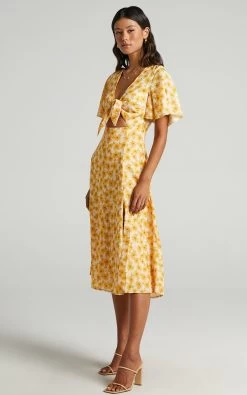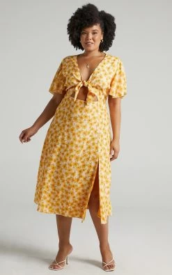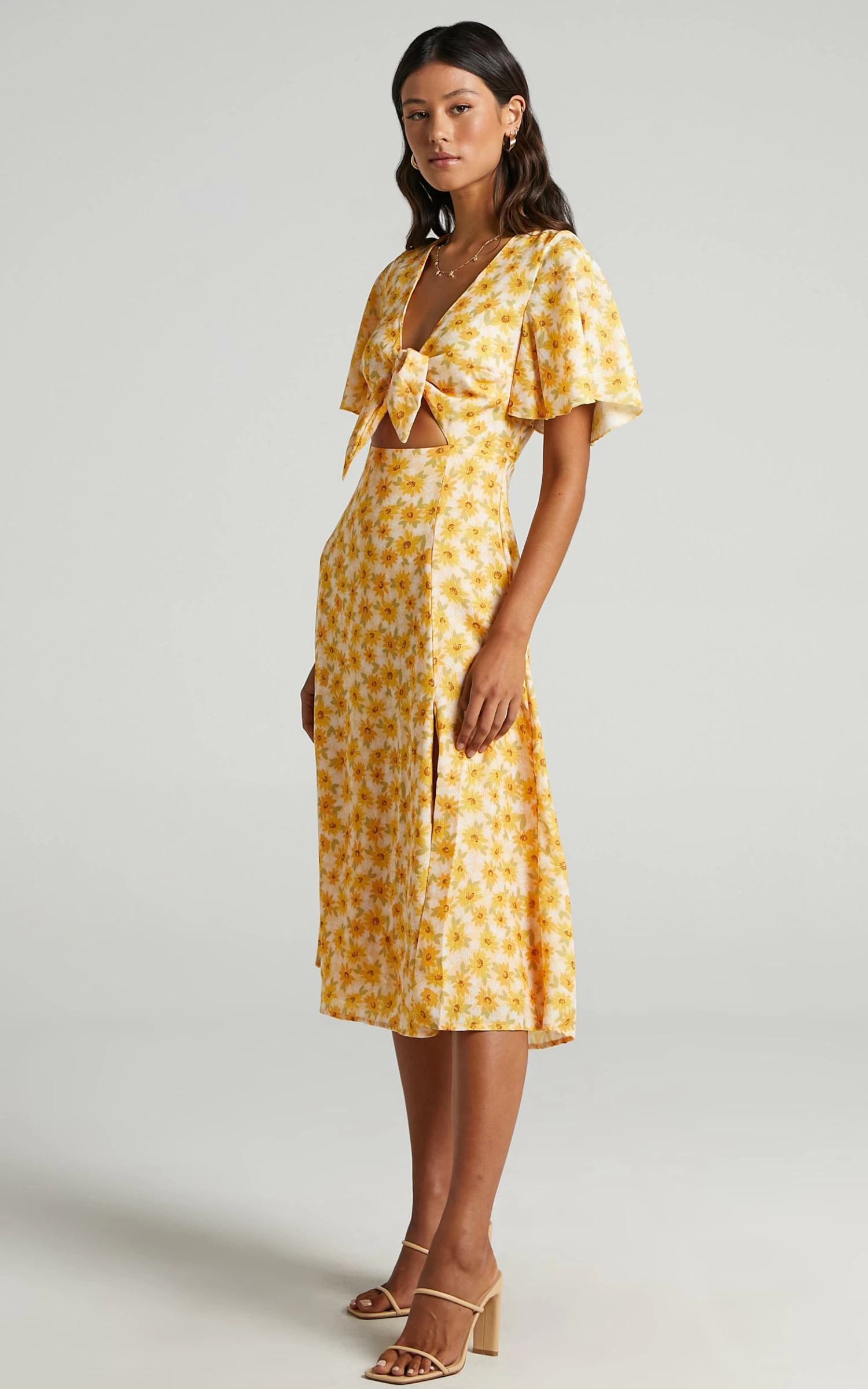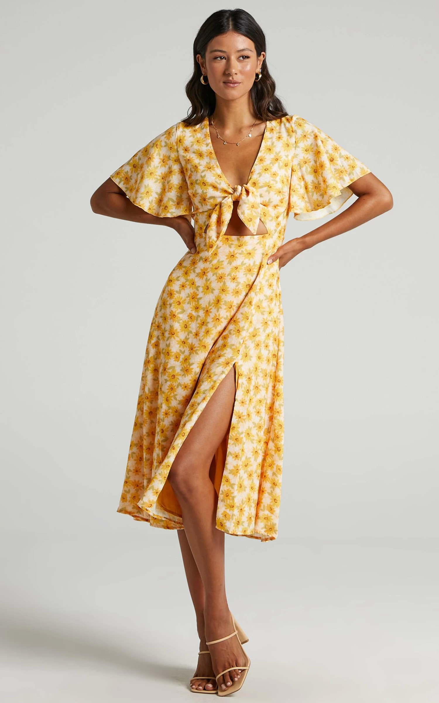 How dreamy and summery is our Wild And Free Mind Dress?! This gorgeous midi features a plunging neckline with tie detail, a cut out on the centre front, short bell sleeves and a thigh split. It’s perfect for those upcoming day events and occasions coming up. Wear it with sneakers for a casual look or go dressy with heeled sandals and a mini handbag!